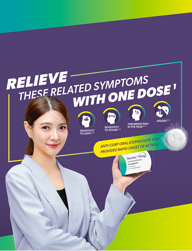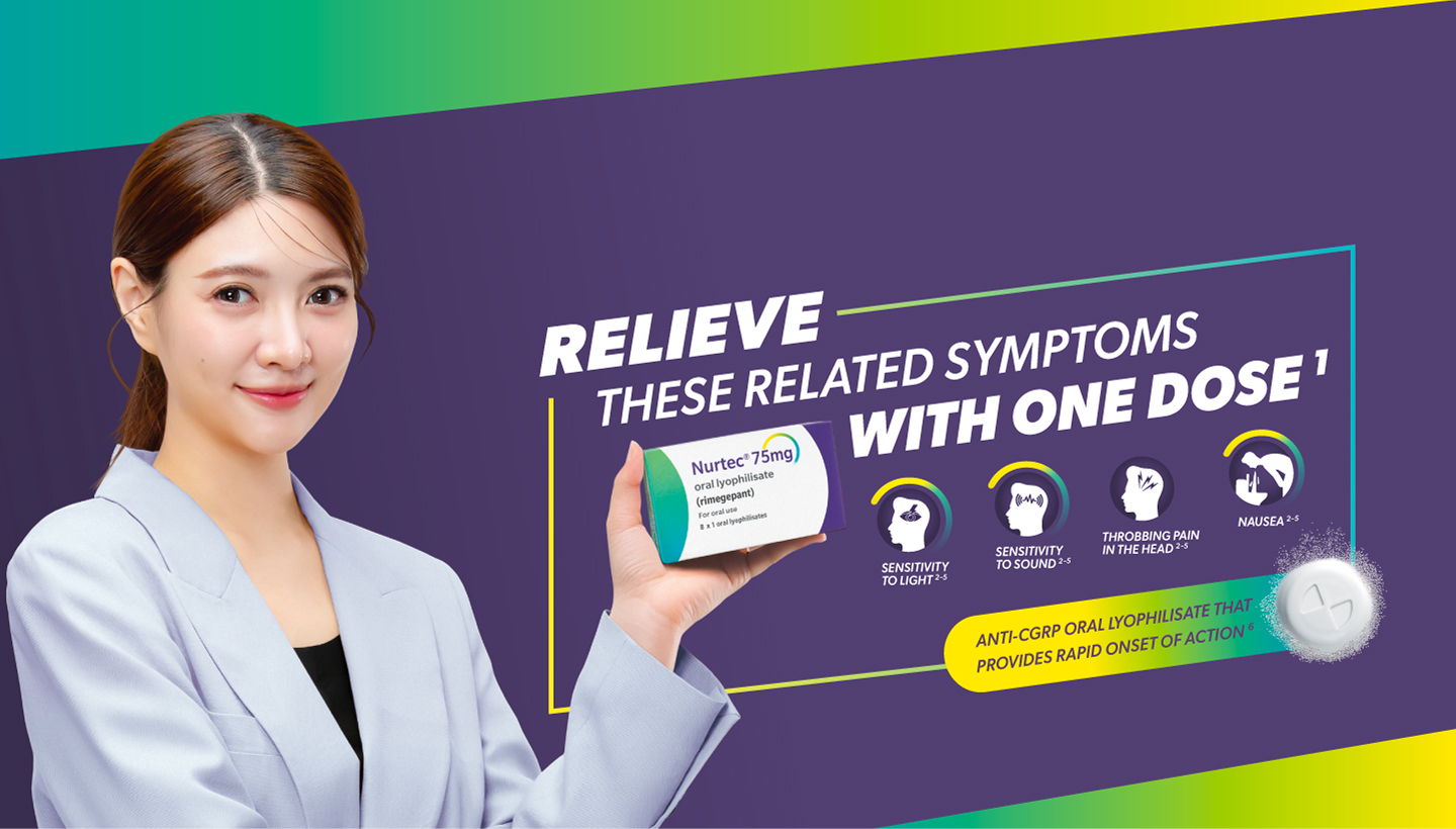 Nurtec (active ingredient: rimegepant) is an anti-calcitonin gene-related peptide (CGRP) oral lyophilisate (a tablet that can disintegrate in the mouth) that helps relieve these related symptoms.1